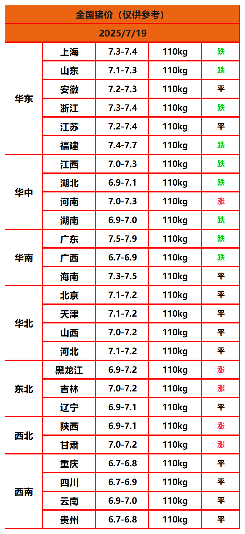 2025年7月19日猪价,今日全国猪价行情走势:5涨12平9跌。
