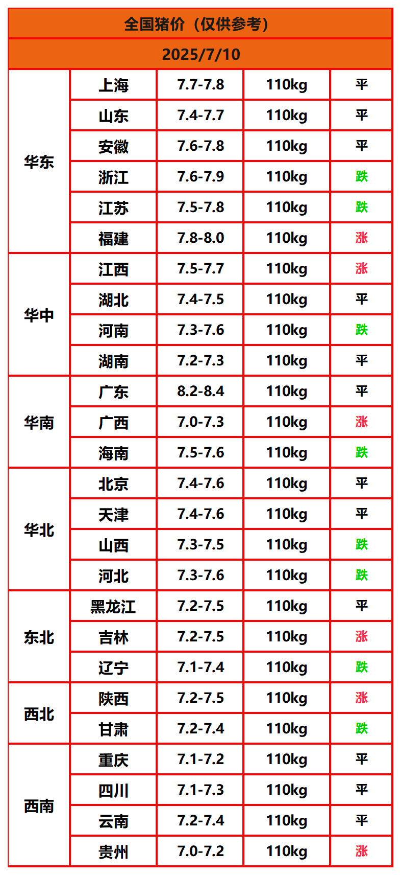 2025年7月10日猪价,今日全国猪价行情走势:6涨12平8跌。