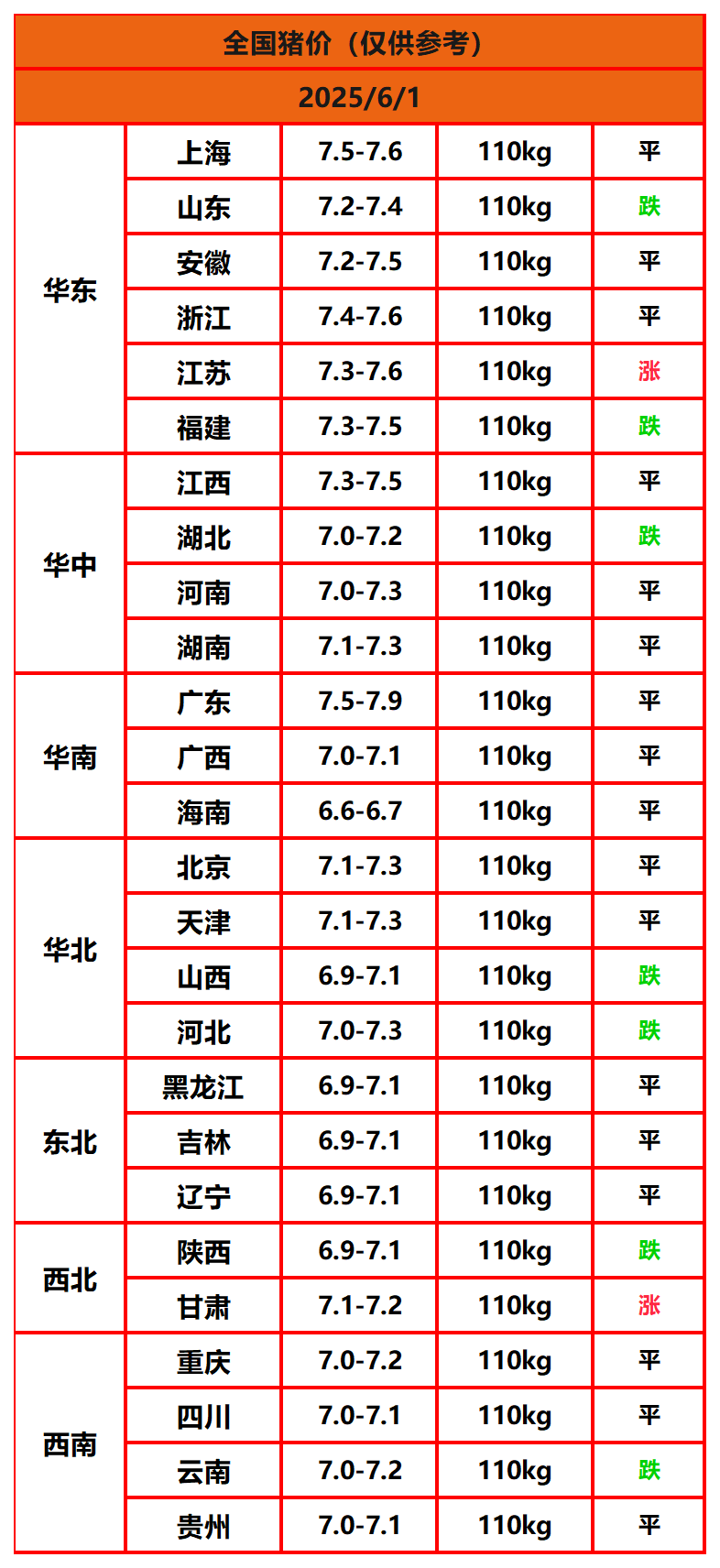 2025年6月1日猪价,今日全国猪价行情走势:2涨17平7跌。