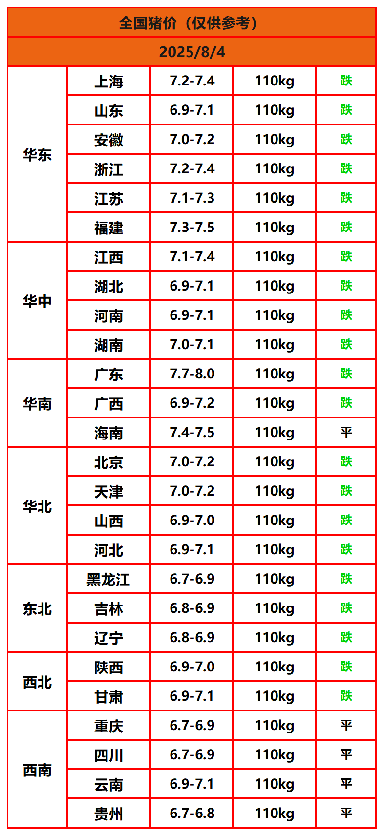 2025年8月4日猪价,今日全国猪价行情走势:0涨5平21跌。
