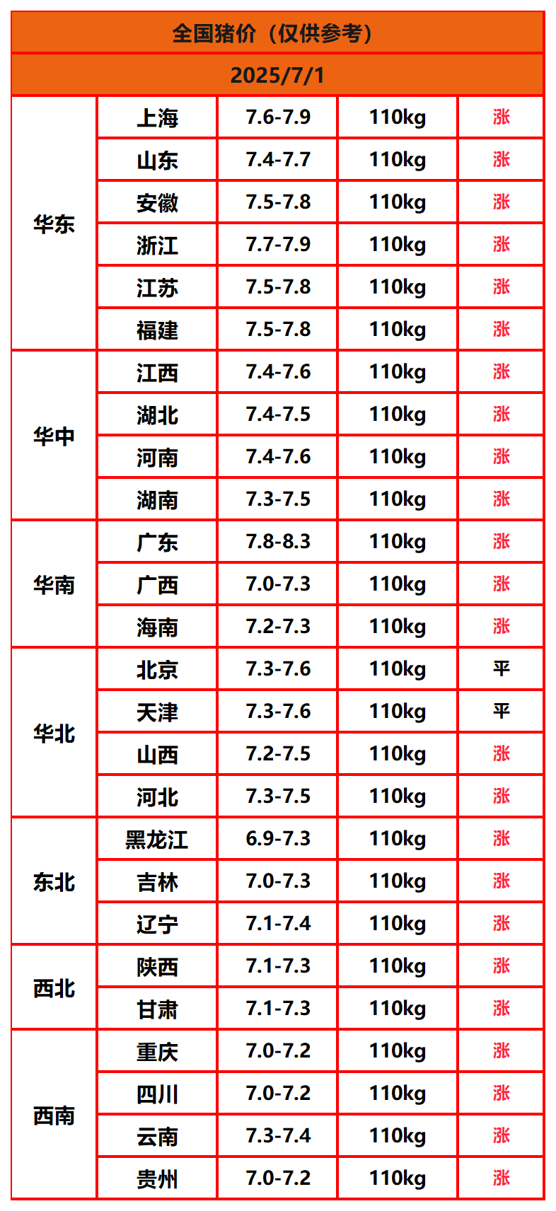 2025年7月1日猪价,今日全国猪价行情走势:24涨2平0跌。