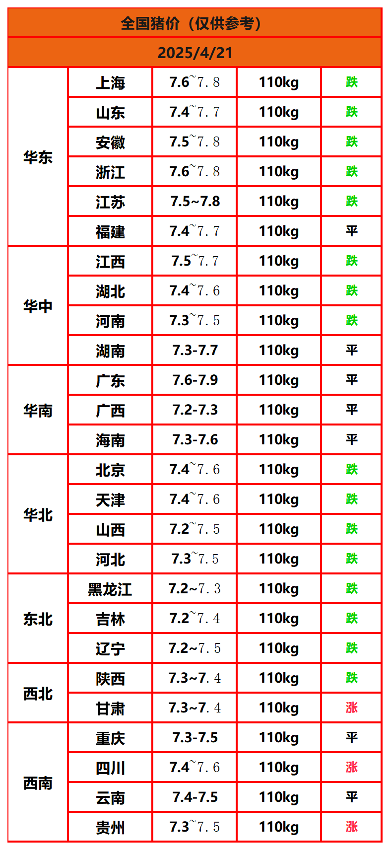 2025年4月21日猪价,今日全国猪价行情走势:3涨7平16跌。